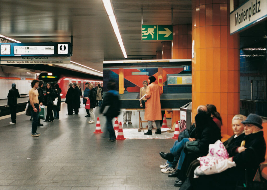 Parallel to the exhibition “Offensive Painting” at the municipal art gallery Lothringer13 in Munich, an invitation is being given to the temporary studio in the Marienplatz S-Bahn station – a staged public model situation with semi-nude figures, in order to paint the picture “Ecce homo, Marienplatz”.
