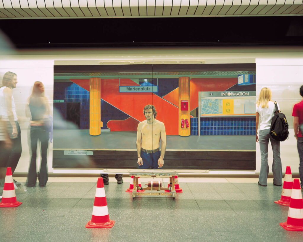 Parallel to the exhibition “Offensive Painting” at the municipal art gallery Lothringer13 in Munich, an invitation is being given to the temporary studio in the Marienplatz S-Bahn station – a staged public model situation with semi-nude figures, in order to paint the picture “Ecce homo, Marienplatz”.
